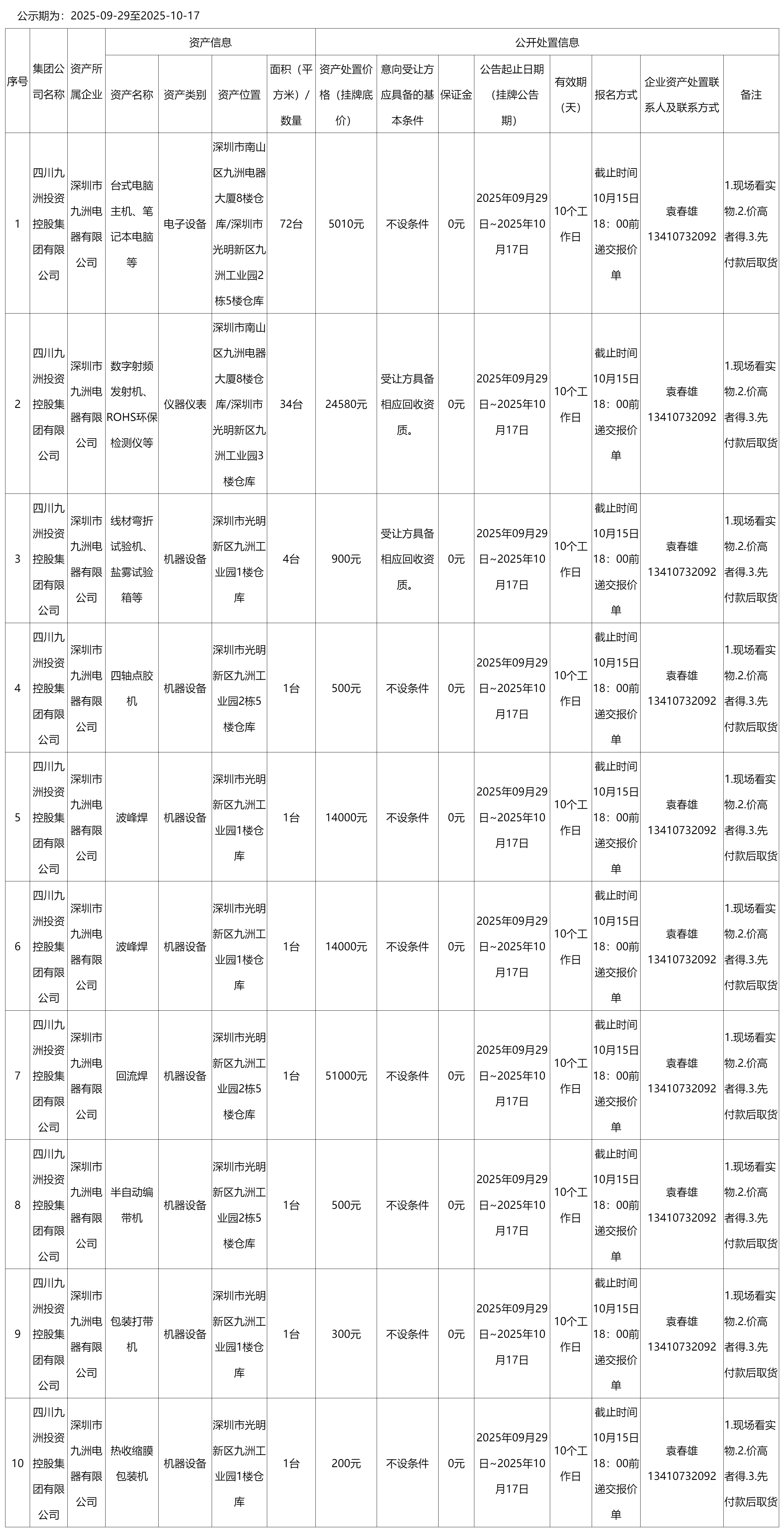 深圳市九洲电器有限公司资产处置公告