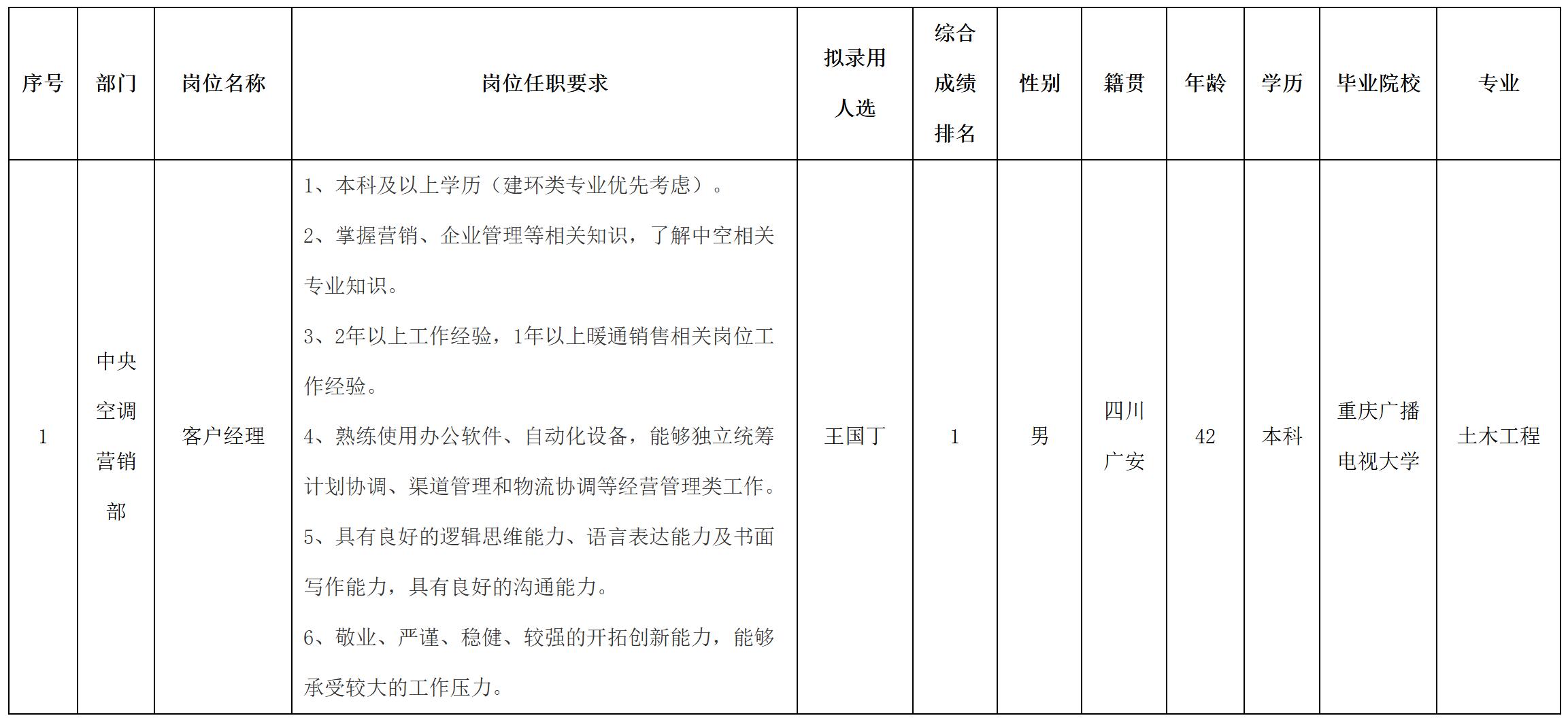 根据四川长虹空调有限公司发布的招聘公告及招聘相关规定,经面试,拟录用王国丁到长虹空调工作,现予以公示,具体情况如下:
