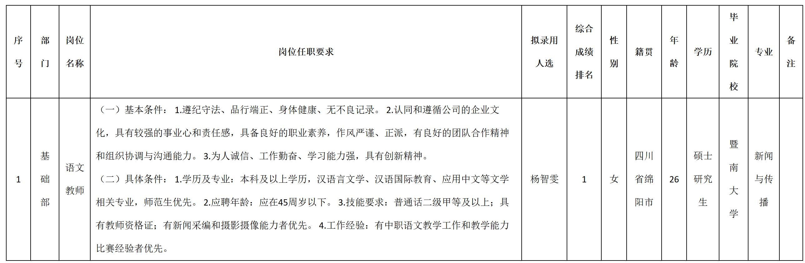 根据四川九洲教育投资管理有限公司发布的招聘公告及招聘相关规定,经测试、考察、体检等程序,拟录用杨智雯同志到四川九洲教育投资管理有限公司工作,现予以公示,具体情况如下: