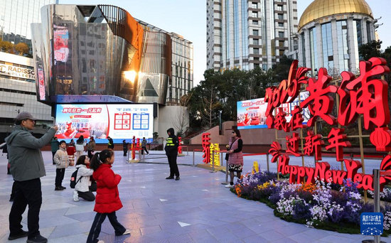1月3日,市民游客在上海南京东路步行街世纪广场上的春节装饰前拍照。新华社记者 方喆 摄