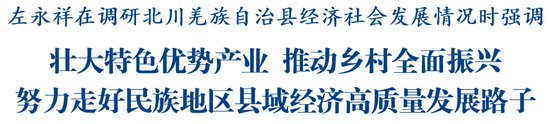 调研中,左永祥听取了北川经济社会发展情况汇报,对相关工作取得的成绩给予肯定。他指出,北川生态禀赋良好、区位优势突出、民族特色鲜明,要发挥比较优势,精准聚焦用力,切实把独特的民族文化特色、优良的山水生态资源转化为现实生产力和发展竞争力。要推动乡村全面振兴,总结用好先行区建设经验,以片区为单元推进规划、建设,大力发展乡村富民产业,推动农村基础设施完善、公共服务优化、社会治理增效,以乡村全面振兴新成效回报习近平总书记的关心关怀和殷切期望。要培育特色优势产业,在全市产业布局中找准主攻方向和细分领域,加快培育壮大低空经济,做深做实“文旅+”文章,多措并举推动一二三产业融合发展,筑牢县域经济发展的产业支撑。要更好统筹发展和安全,以“时时放心不下”的责任感,抓实抓细安全生产各项工作,牢牢守住生态保护红线,确保社会安定有序,以高水平安全护航高质量发展。要抓好“十五五”开局起步各项工作,全力以赴拼经济、抓项目、促发展,对照年度目标细化分解任务,一项一项抓好落实,奋力夺取一季度“开门红”,为实现全年目标任务打下基础、赢得主动。
