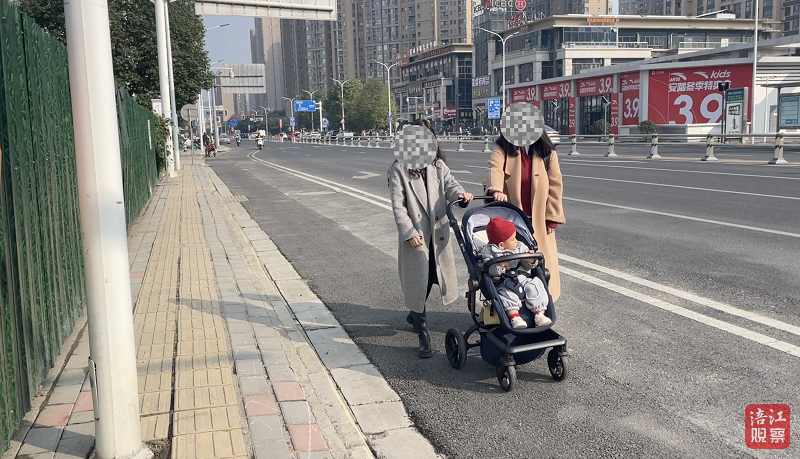 行人推着婴儿车在非机动车道上行走