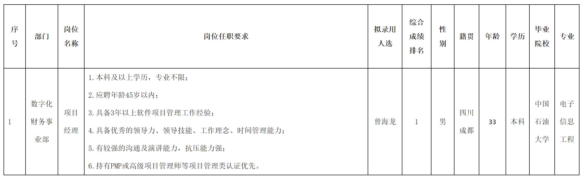 根据四川虹信软件股份有限公司发布的招聘公告及招聘相关规定,经测试、考察、体检等程序,拟录用曾海龙同志到四川虹信软件股份有限公司工作,现予以公示,具体情况如下:
