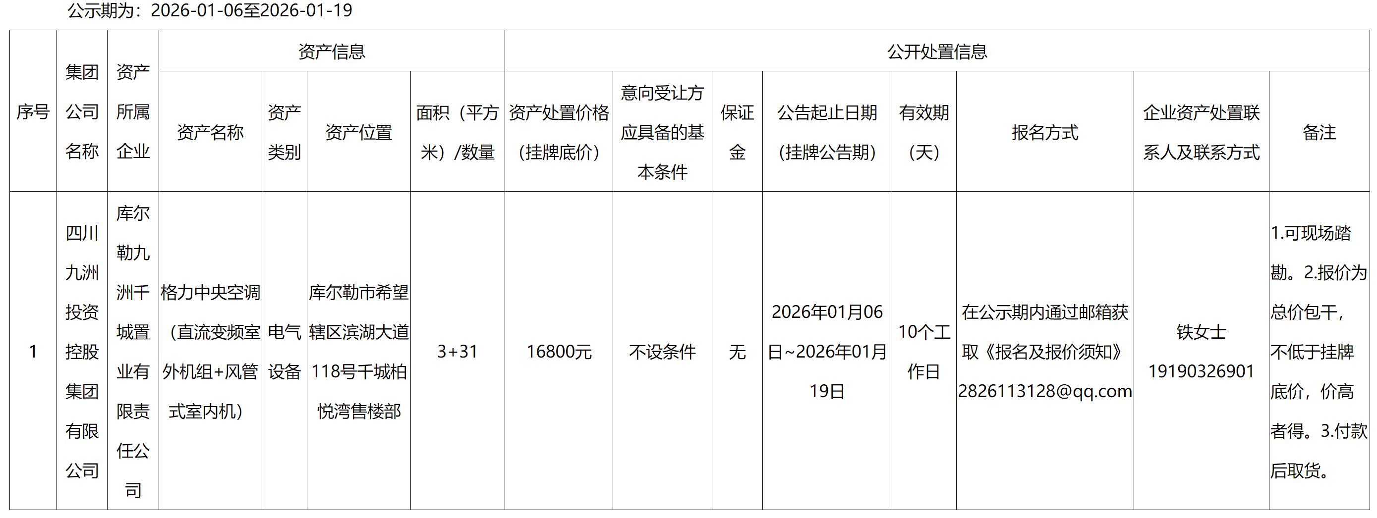 库尔勒九洲千城置业有限责任公司柏悦湾售楼部中央空调处置公告