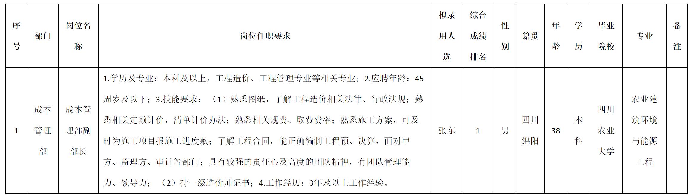 根据四川九洲建筑工程有限责任公司发布的招聘公告及招聘相关规定,经测试、考察、体检等程序,拟录用张东同志到四川九洲建筑工程有限责任公司工作,现予以公示,具体情况如下: