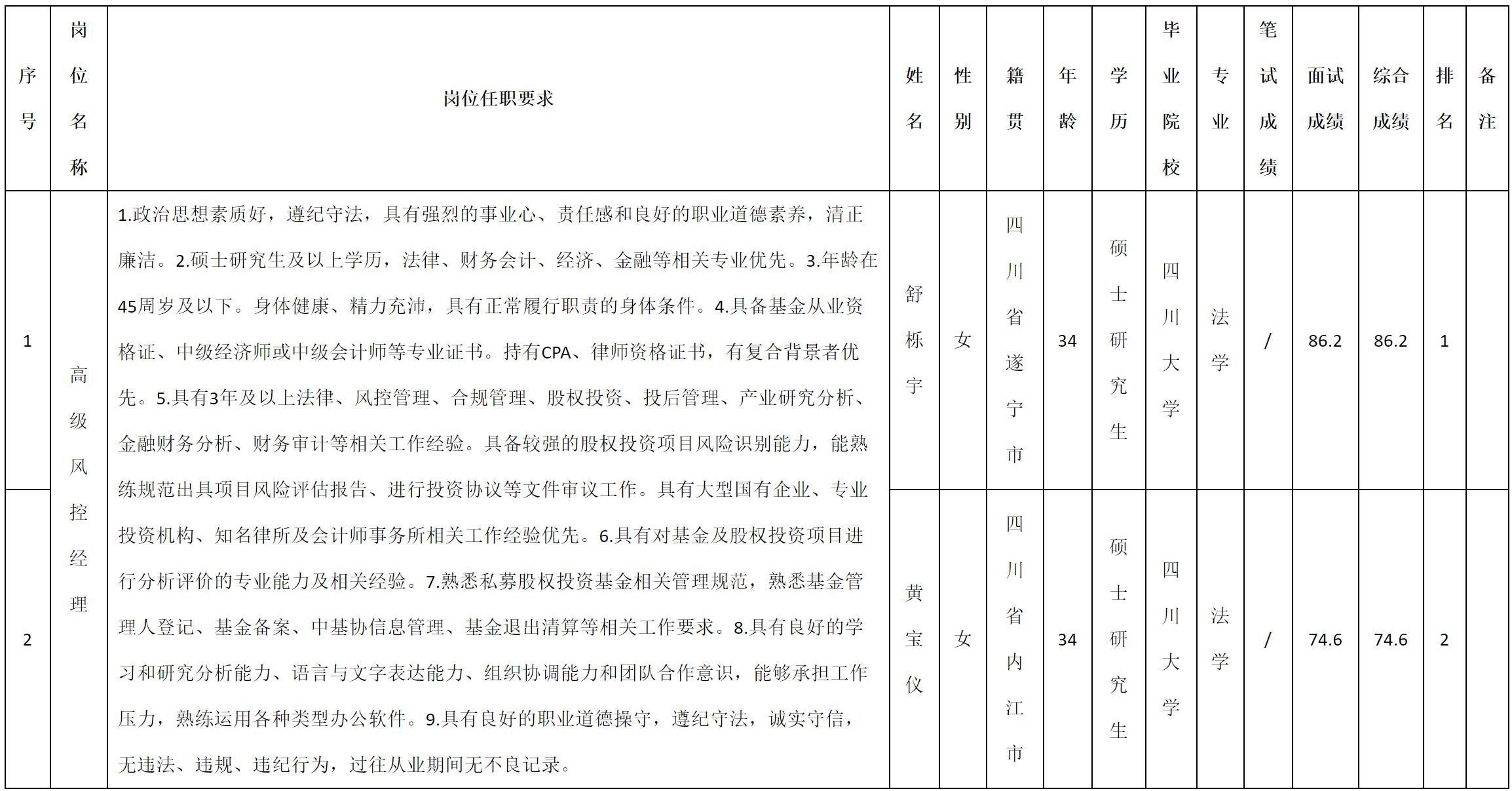 根据四川九洲君合私募基金管理有限公司发布的招聘公告及招聘相关规定,现将测试成绩予以公示。