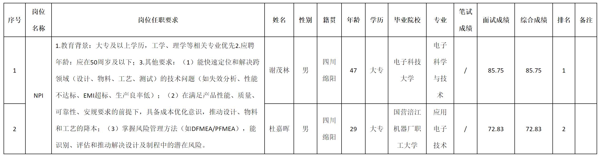 根据四川九州电子科技股份有限公司发布的招聘公告及招聘相关规定,现将测试成绩予以公示。