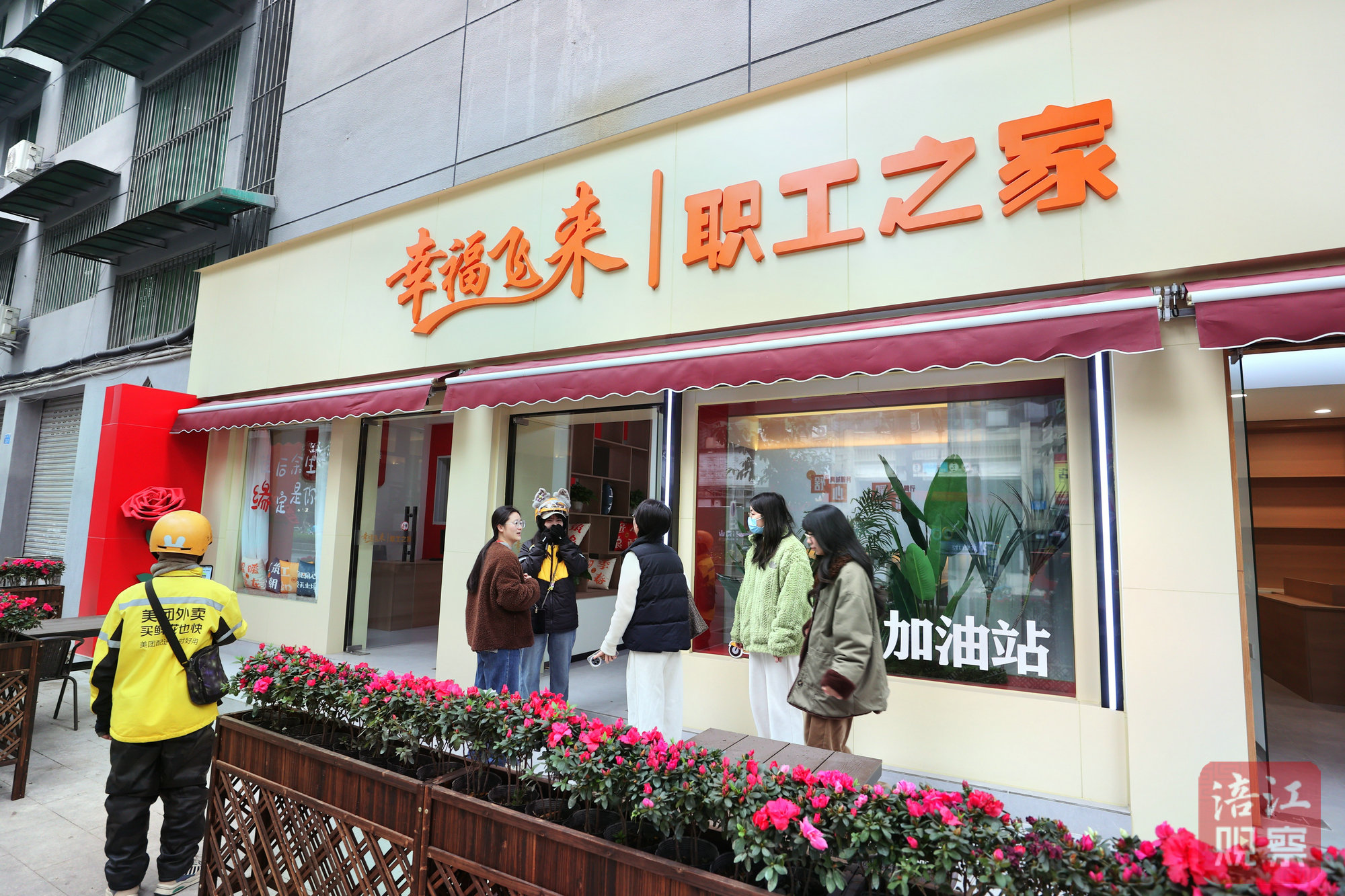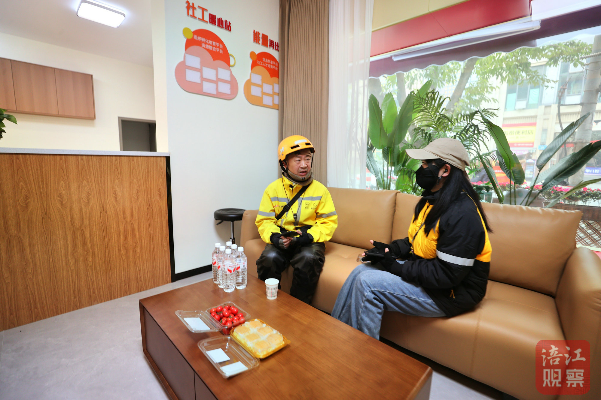 这个大约120平方米的空间,已成为刘晓峰和同事们在街头的“家”。驿站配备了饮水机、充电装置、微波炉、急救药箱等设施,为新就业形态劳动者提供暖心的“能量补给”。
