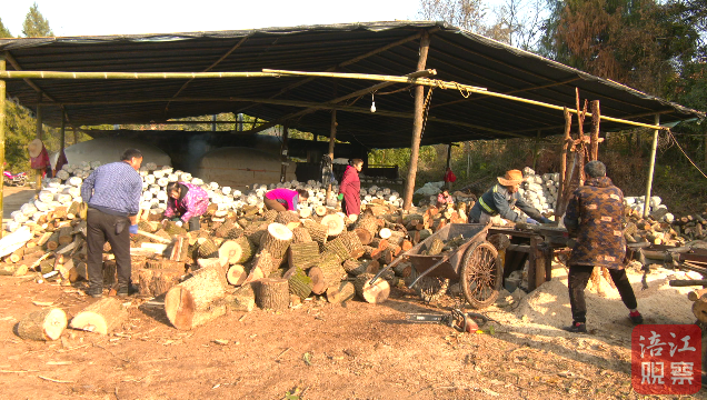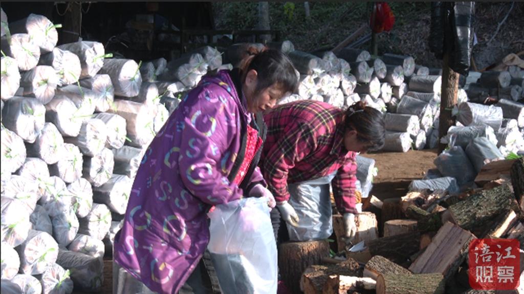 在现场,男工们协力将粗壮的原木裁截成段,再劈成规整的木块;女工们紧随其后,熟练地将木块装填入袋,扎实封口,一个个待孕育的菌棒便初具雏形。