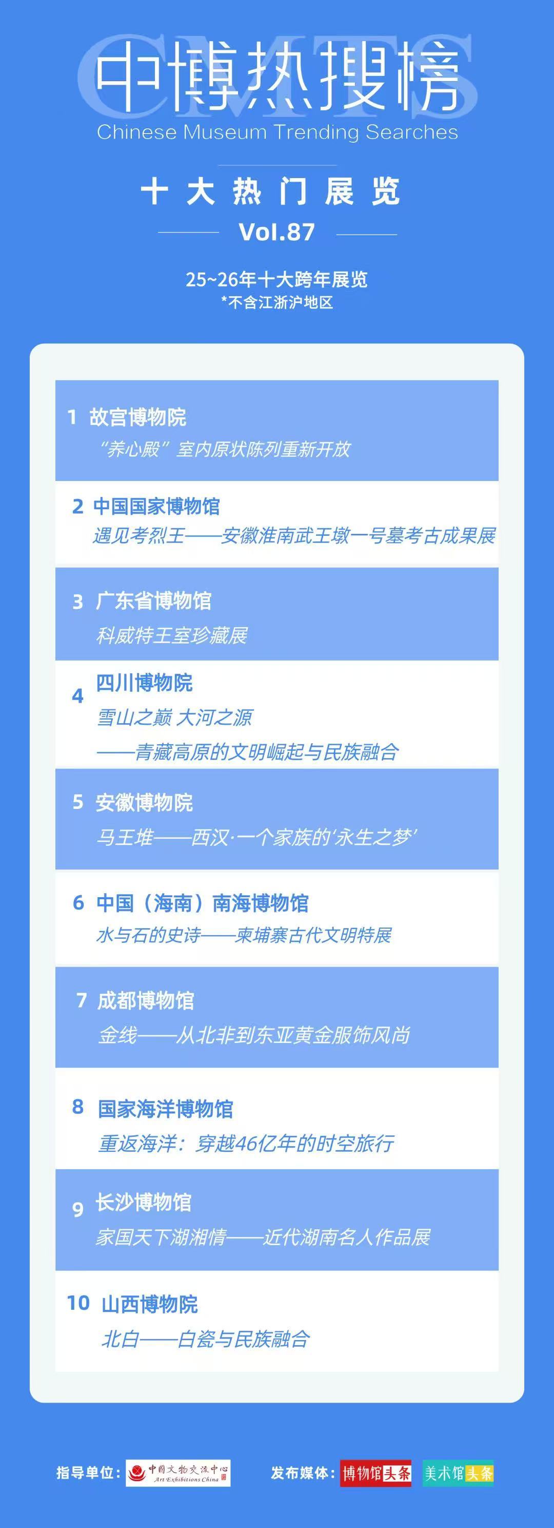 中博热搜榜由中国文物交流中心指导、博物馆头条统计发布,数据基于全网实时抓取和AI模型分析。2025年中博热搜榜分为多类榜单,包括全国热门博物馆百强、热门展览百强(如基本陈列、临展)、地区性榜单及专题榜单等。榜单按季度(第一季度至第三季度)和年度发布,覆盖全国6565家备案博物馆。