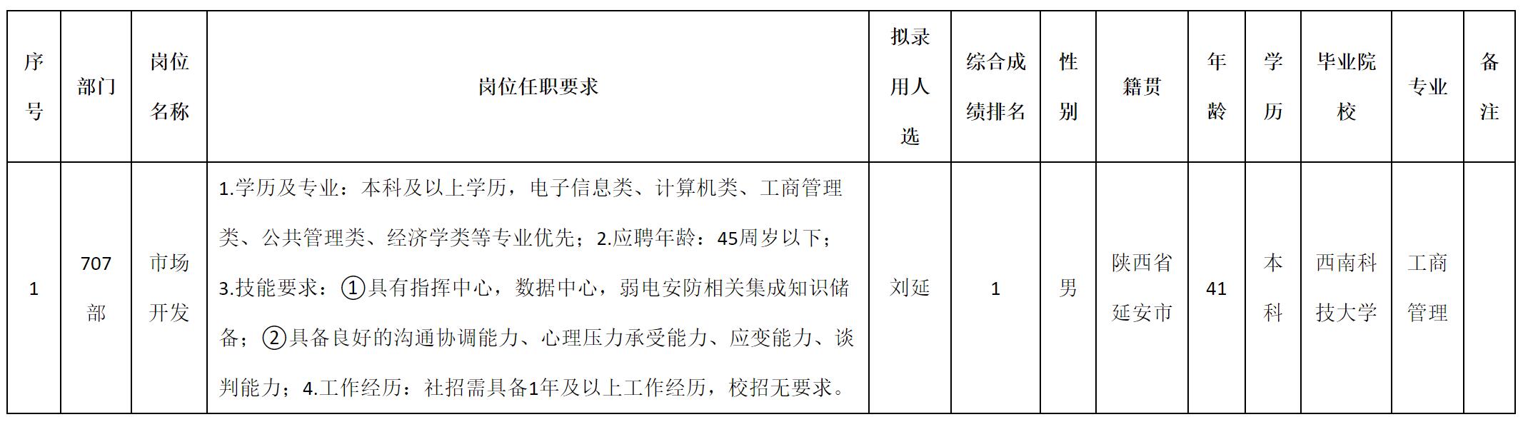 根据四川九洲电器集团有限责任公司发布的招聘公告及招聘相关规定,经测试、考察、体检等程序,拟录用刘延同志到四川九洲电器集团有限责任公司工作,现予以公示,具体情况如下:
