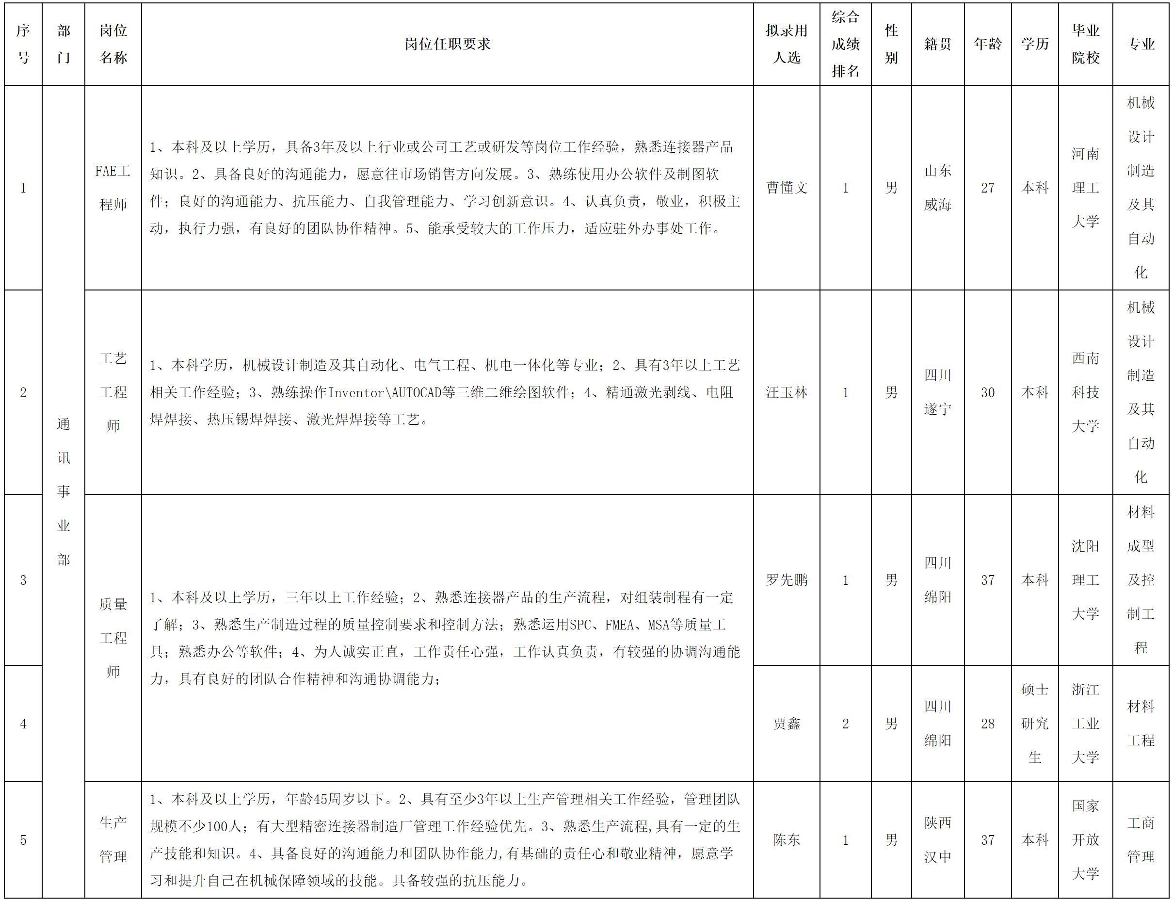 根据四川华丰科技股份有限公司发布的招聘公告及招聘相关规定,经测试等程序,拟录用曹懂文等同志到四川华丰科技股份有限公司工作,现予以公示,具体情况如下: