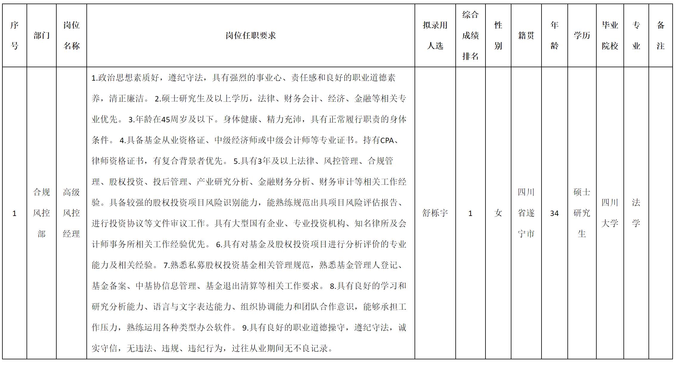 根据四川九洲君合私募基金管理有限公司发布的招聘公告及招聘相关规定,经测试、考察、体检等程序,拟录用舒栎宇同志到四川九洲君合私募基金管理有限公司工作,现予以公示,具体情况如下: