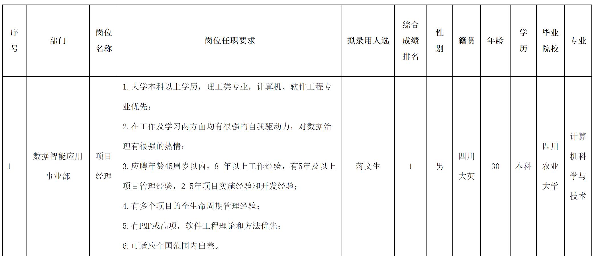根据四川虹信软件股份有限公司发布的招聘公告及招聘相关规定,经测试、考察、体检等程序,拟录用蒋文生同志到四川虹信软件股份有限公司工作,现予以公示,具体情况如下: