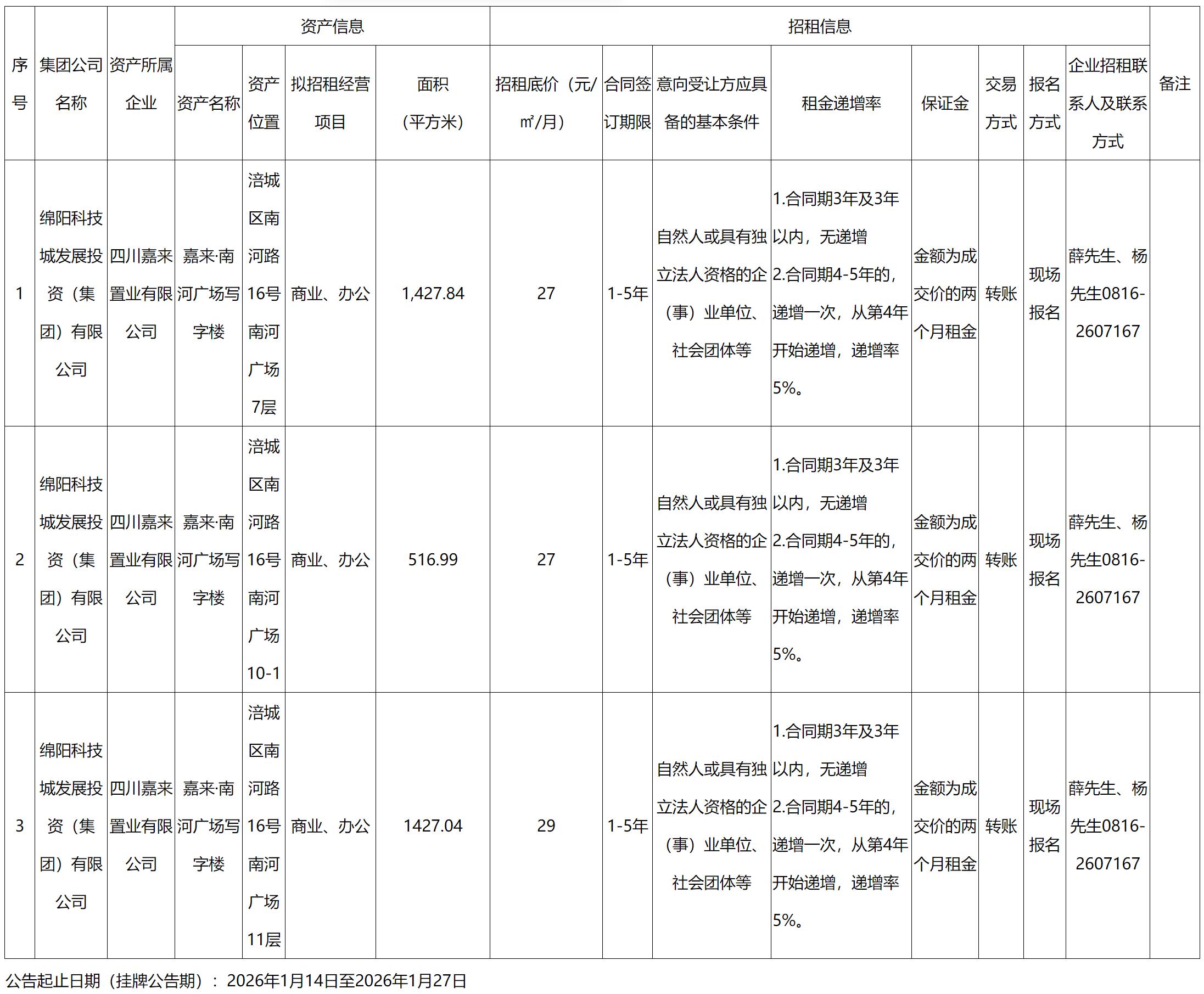 四川嘉来置业有限公司资产出租公告