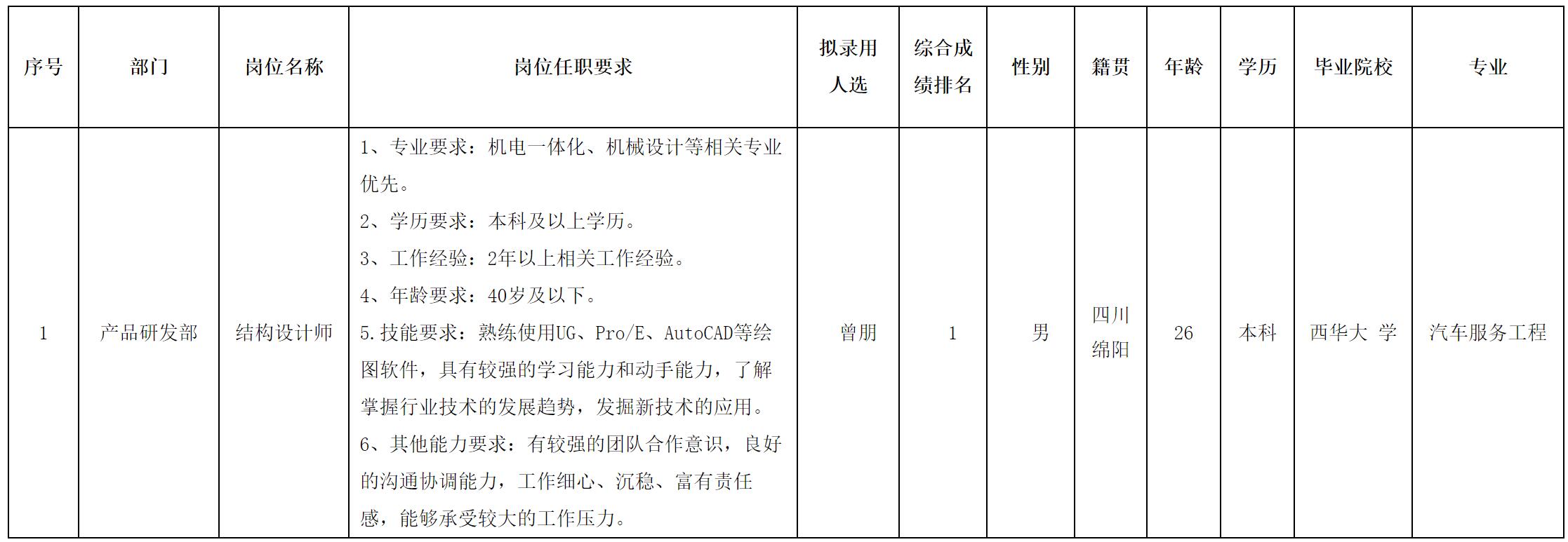 根据四川爱创科技有限公司发布的招聘公告及招聘相关规定,经面试、考察、体检等程序,拟录用曾朋同志到产品研发部工作,现予以公示,具体情况如下: