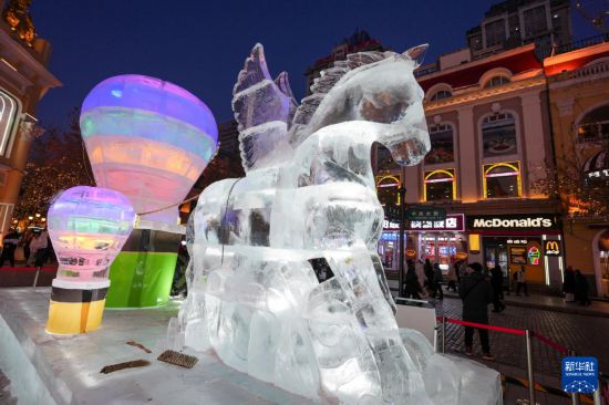 入冬以来,哈尔滨的百年老街中央大街增添了数十个冰雕景观,把中央大街装饰得流光溢彩,吸引众多市民和游客游览参观。