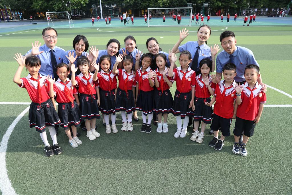 2025年5月26日,重庆检察未成年人保护工作团队代表在北碚区两江名居第一小学开展校园普法活动后与学生合影。(新华社发)