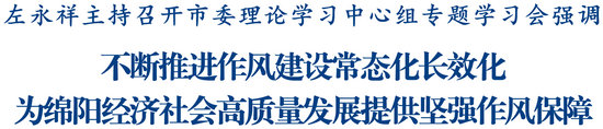 绵阳新闻网讯 1月20日,市委理论学习中心组举行专题学习会,围绕“锲而不舍落实中央八项规定精神、推进作风建设常态化长效化”主题开展学习研讨。省委常委、市委书记左永祥主持会议并谈认识体会。他强调,要深入学习贯彻习近平总书记关于加强党的作风建设的重要论述和在中央政治局民主生活会上的重要讲话精神,不断推进作风建设常态化长效化,为绵阳经济社会高质量发展提供坚强作风保障。