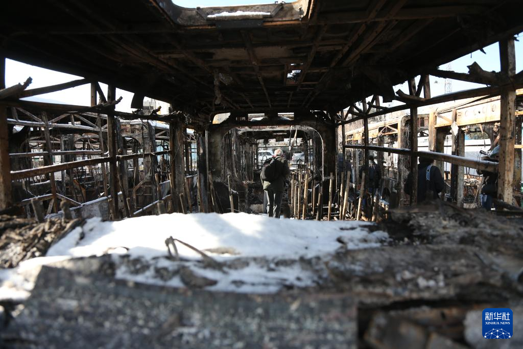 1月21日,在伊朗首都德黑兰,一名男子站在一辆于近期骚乱中被烧毁的公交车内。新华社记者 沙达提 摄