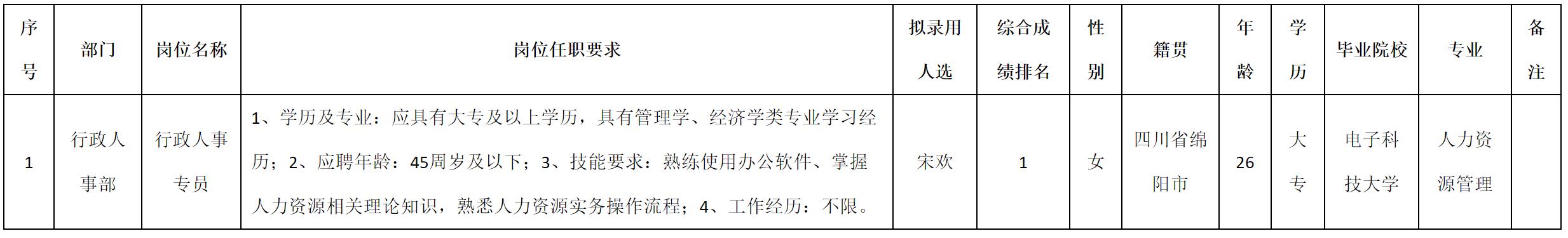 根据四川九华光子通信技术有限公司发布的招聘公告及招聘相关规定,经测试、考察、体检等程序,拟录用宋欢同志到四川九华光子通信技术有限公司工作,现予以公示,具体情况如下: