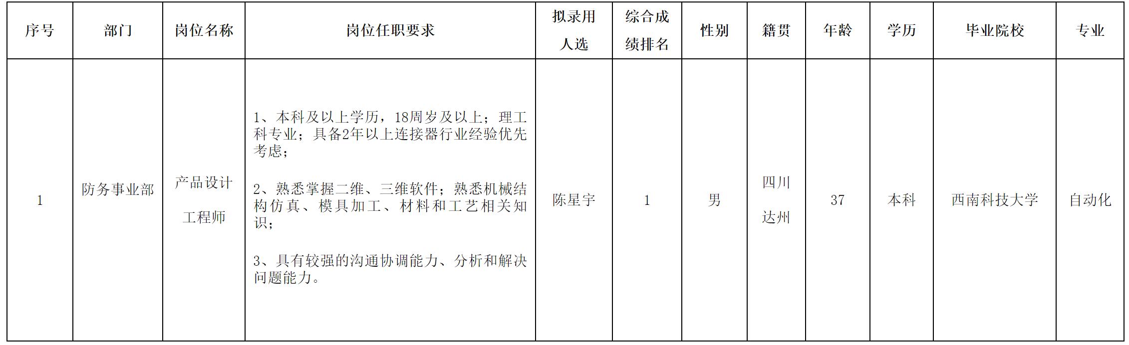 根据四川华丰科技股份有限公司发布的招聘公告及招聘相关规定,经面试、考察、体检等程序,拟录用陈星宇同志到四川华丰科技股份有限公司工作,现予以公示,具体情况如下: