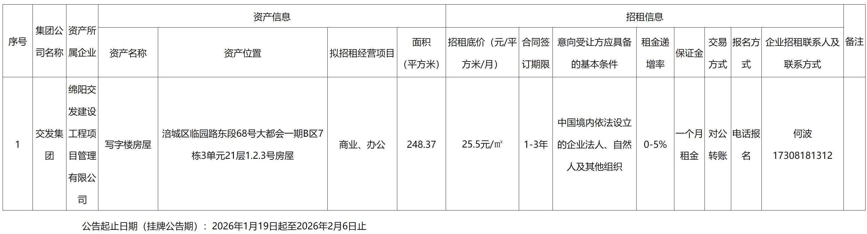 绵阳交发建设工程项目管理有限公司经营性资产招租公告