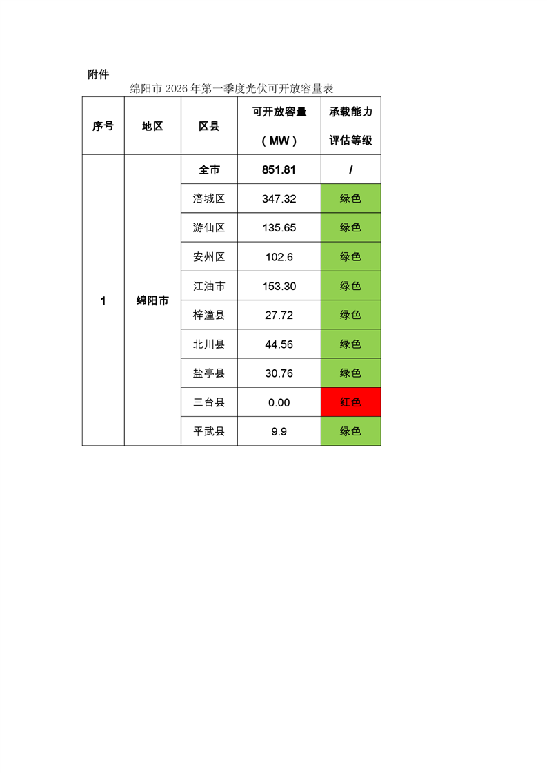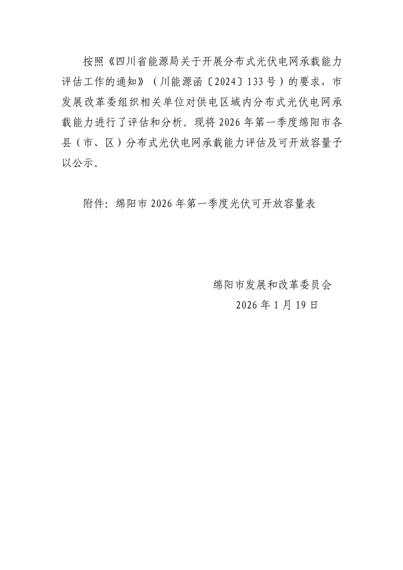 绵阳市发展和改革委员会关于对2026年第一季度分布式光伏电网承载能力评估及可开放容量的公示