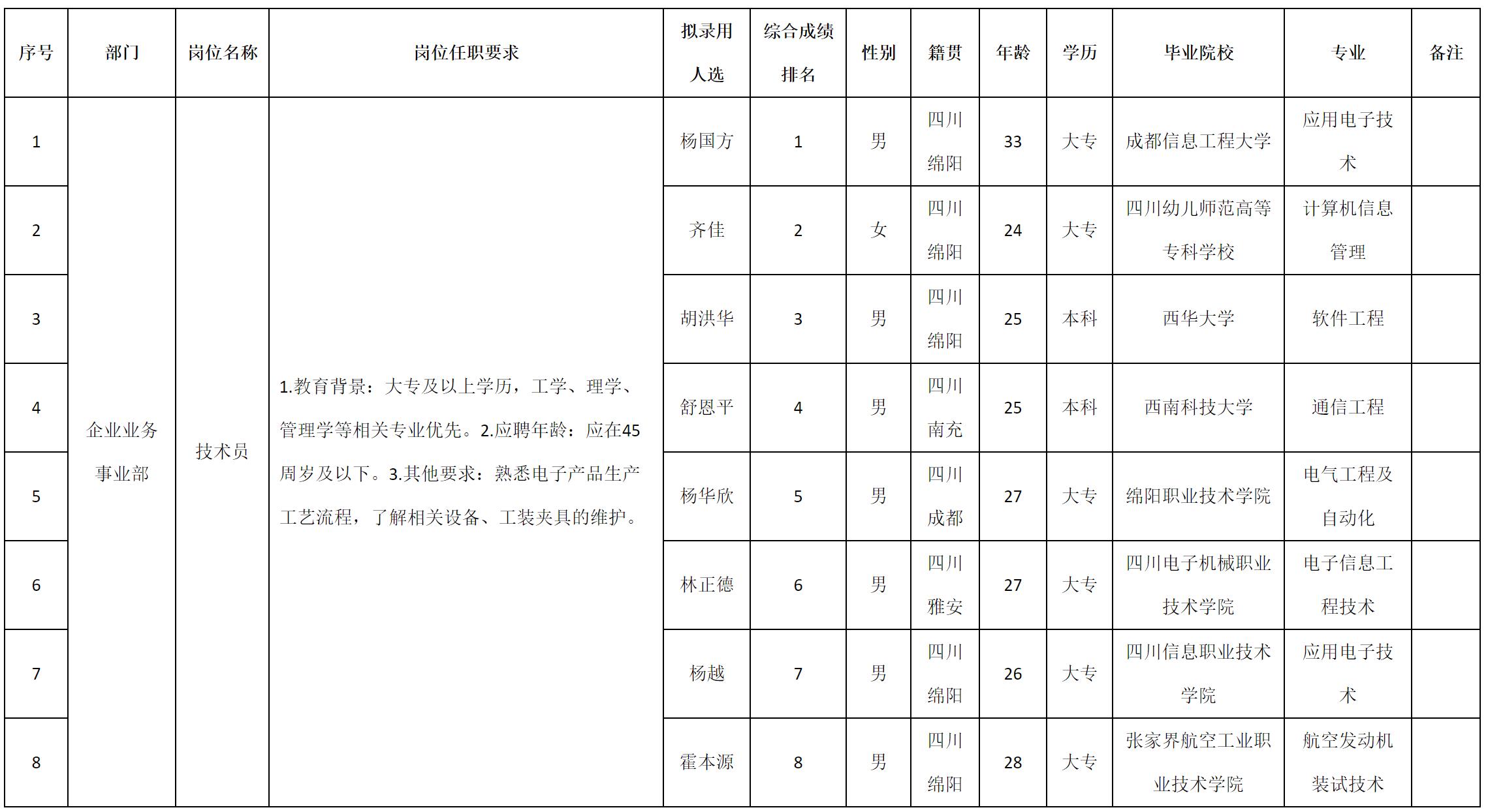 根据四川九州电子科技股份有限公司发布的招聘公告及招聘相关规定,经测试、考察、体检等程序,拟录用杨国方等8名同志到四川九州电子科技股份有限公司工作,现予以公示,具体情况如下: