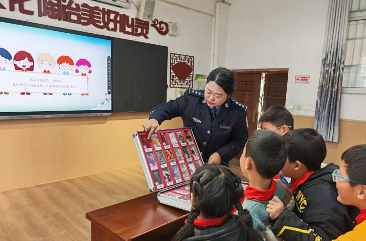 随后,派出所民警聚焦禁毒宣传主题,为学生们带来了生动详实的禁毒知识讲解。民警从毒品的定义、分类入手,重点介绍了新型毒品的伪装形式,如“跳跳糖”“奶茶杯”“巧克力”等看似日常食品的新型毒品,揭露了其隐蔽性、迷惑性和严重危害性。为让学生们更直观地认识新型毒品,民警现场带来了新型毒品展示道具箱,逐一展示各类新型毒品样本,结合案例讲解毒品对个人健康、家庭幸福和社会稳定的毁灭性影响,让学生们对毒品的危害有了更深刻的认知。