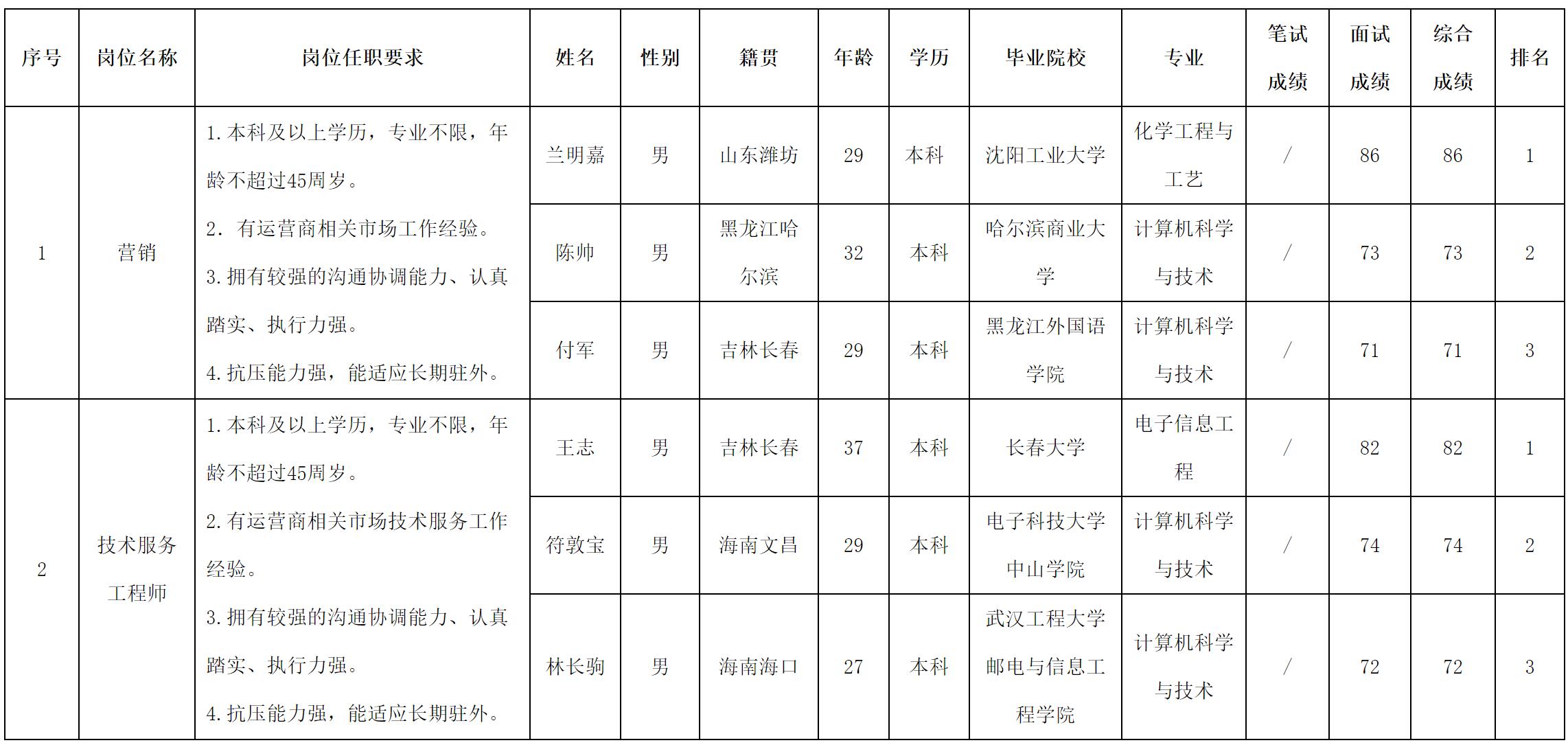根据四川长虹新网科技公司发布的招聘公告及招聘相关规定,现将测试成绩予以公示。