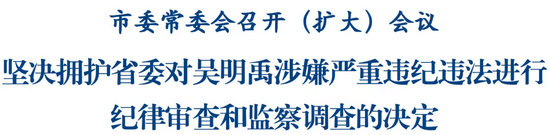 会议指出,省纪委监委对吴明禹涉嫌严重违纪违法进行纪律审查和监察调查,充分彰显了省委坚持反腐败无禁区、全覆盖、零容忍的一贯立场,充分释放了一步不停歇、半步不退让、把反腐败斗争进行到底的强烈信号。市委坚决拥护省委决定,坚决拥护省纪委监委决定,全力协助、配合省纪委监委开展审查调查。全市各地各部门要站在坚定拥护“两个确立”、坚决做到“两个维护”的政治高度,切实把思想和行动统一到党中央关于全面从严治党的部署要求上来、统一到省委决定精神上来,进一步提高政治判断力、政治领悟力、政治执行力,一体推进不敢腐、不能腐、不想腐,坚定不移把反腐败斗争进行到底。