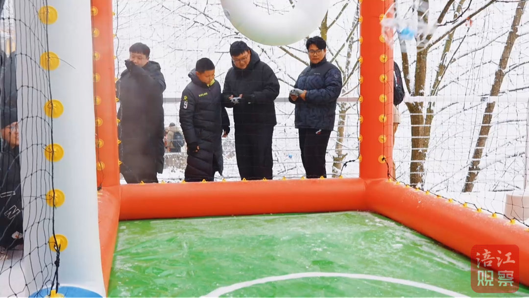 本届冰雪季最引人注目的亮点当属无人机足球。在皑皑白雪之上,数十架无人机急速穿梭、灵活转向,精准完成“传球”“射门”等一系列高难度动作,科技感十足的空中竞技与冰雪美景相映成趣。