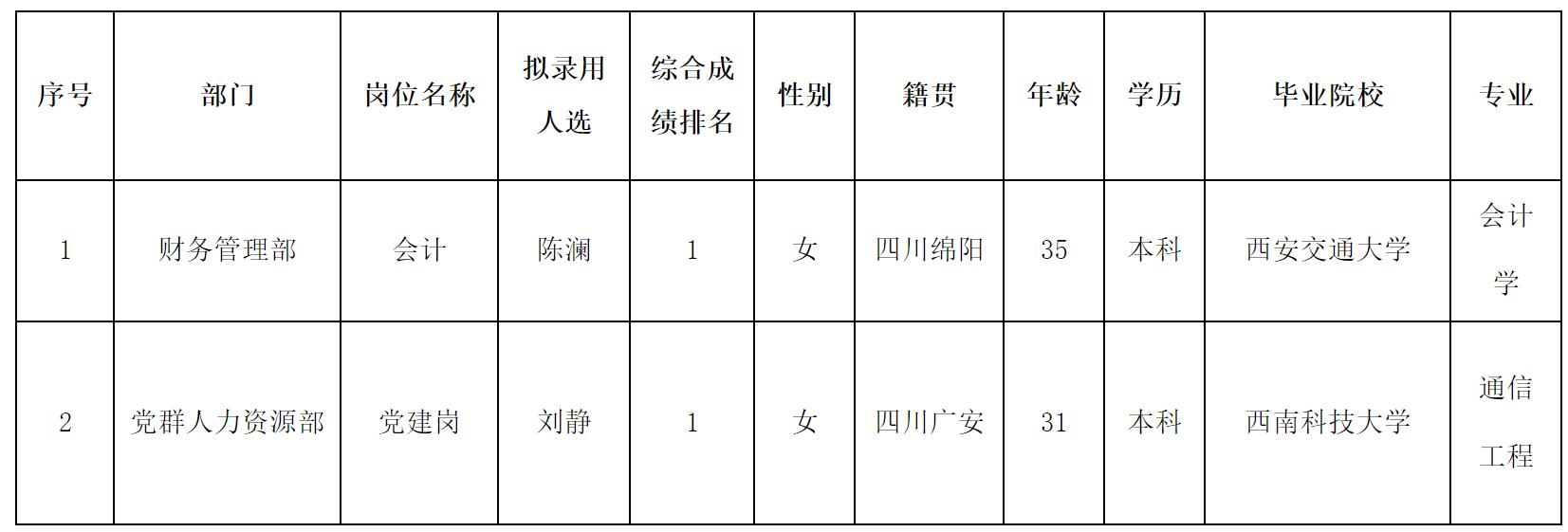 根据绵阳市高水农副产品批发有限公司发布的招聘公告及招聘相关规定,经初试、复试、体检等程序,拟录用陈澜、刘静2名同志到绵阳市高水农副产品批发有限公司工作,现予以公示,具体情况如下: