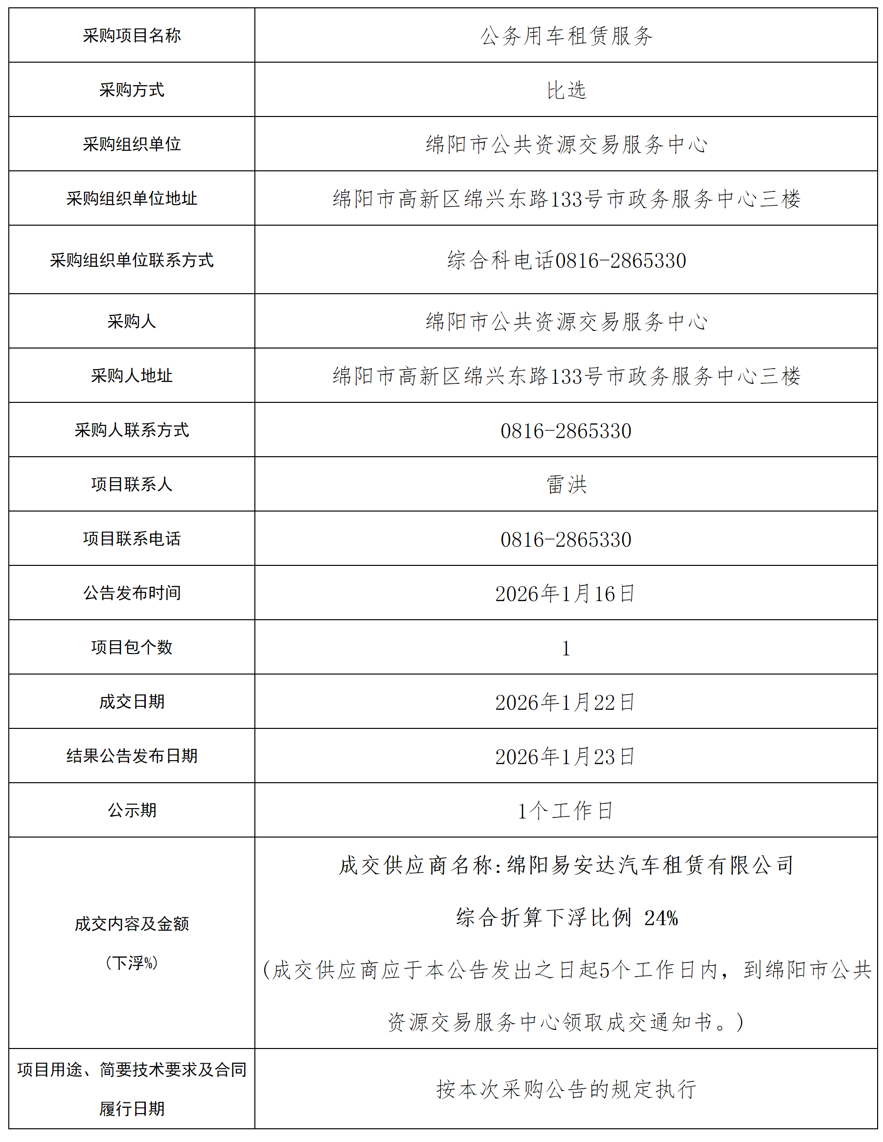 绵阳市公共资源交易服务中心关于“公务用车租赁服务”采购结果的公告