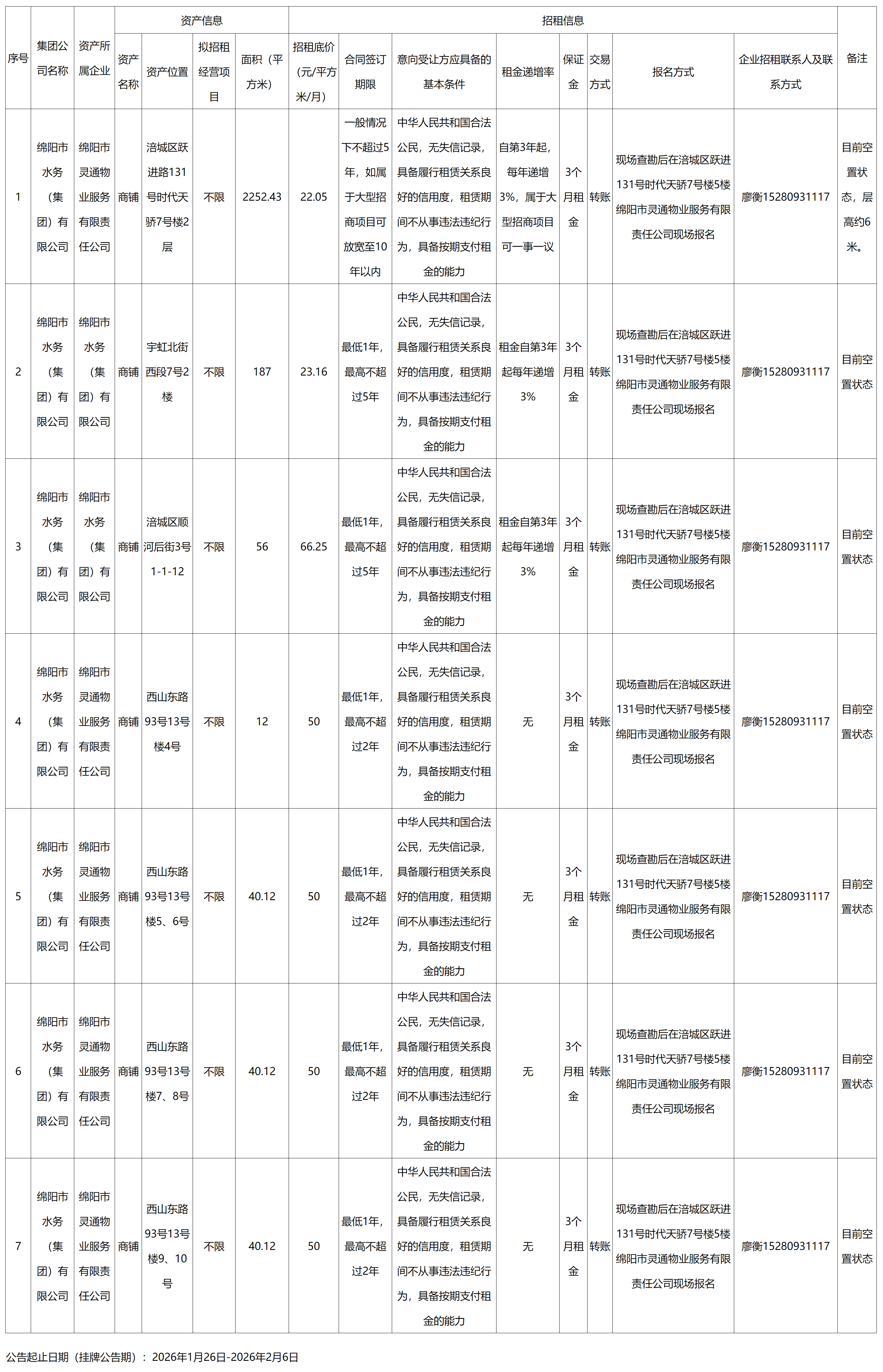 绵阳市水务(集团)有限公司资产出租公告