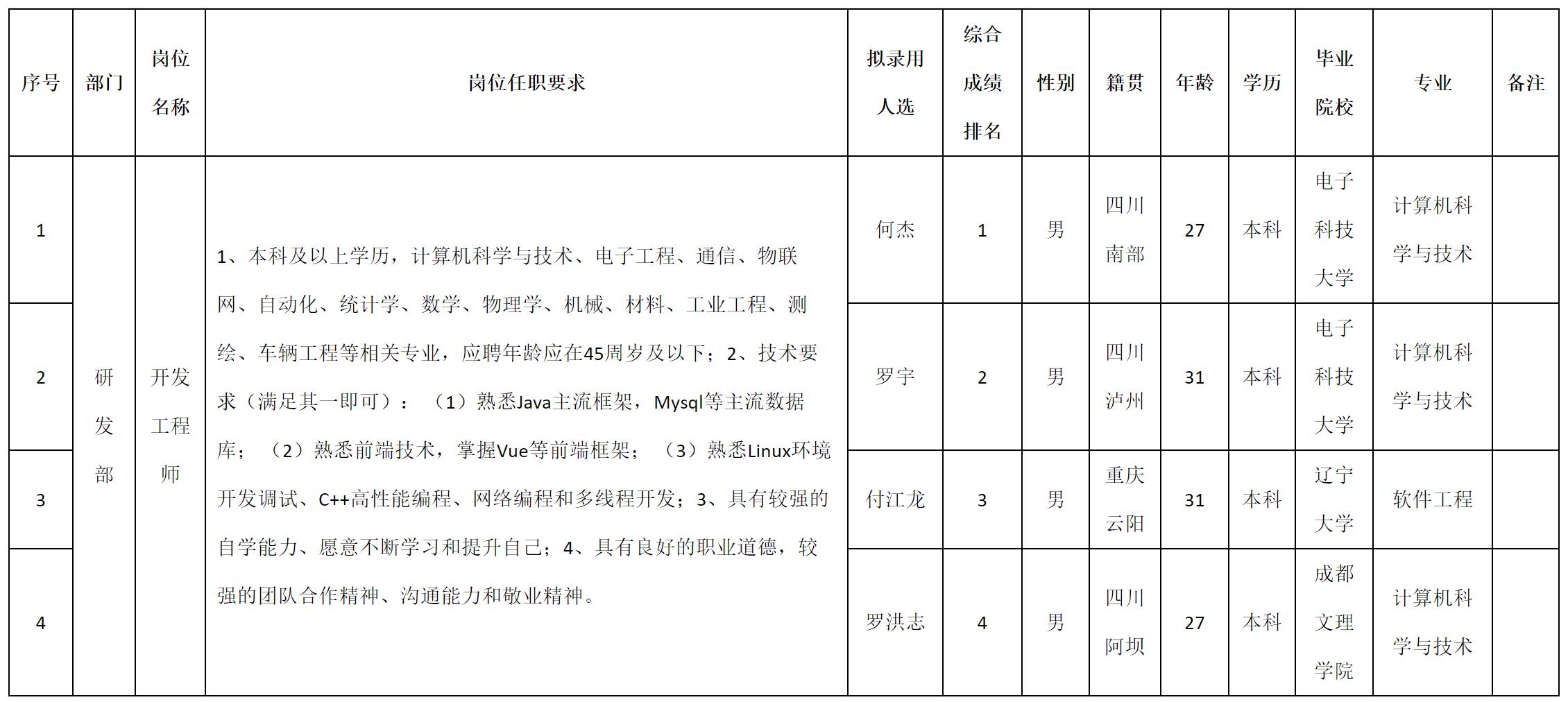 根据四川九洲投资控股集团有限公司软件与数据智能产业发布的招聘公告及招聘相关规定,经测试、考察、体检等程序,拟录用何杰等4名同志到四川九洲投资控股集团有限公司软件与数据智能产业工作,现予以公示,具体情况如下: