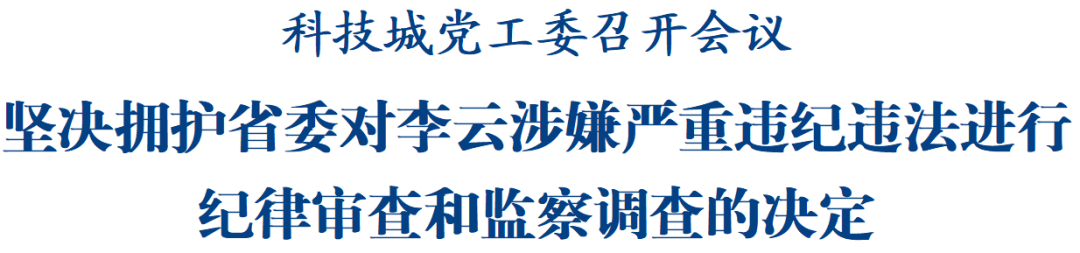 会议指出,省纪委监委对李云涉嫌严重违纪违法进行纪律审查和监察调查,充分体现了省委坚持反腐败无禁区、全覆盖、零容忍的一贯立场和鲜明态度,再次释放了一步不停歇、半步不退让、把反腐败斗争进行到底的强烈信号。科技城党工委坚决拥护省委决定,坚决拥护省纪委监委决定,全力协助配合省纪委监委开展审查调查。科技城党工委管委会要深刻汲取教训,坚持以案为鉴,保持警钟长鸣,增强党纪国法意识,树牢正确的权力观、政绩观、事业观,自觉做到秉公用权、依法用权、廉洁用权,切实把思想和行动统一到党中央关于全面从严治党的部署要求上来、统一到省委决定精神上来。要坚持用改革精神和严的标准管党治党,强化对“关键少数”的监督,加大风腐同查同治力度,一体推进不敢腐、不能腐、不想腐。要坚定不移贯彻全面从严治党方针,以更高标准、更严要求加强自身建设,做到按程序决策、按规矩办事、按制度落实。要加强纪律作风建设,深入开展“严纪律、优作风、提效能”专项行动,推动作风大转变,促进效能大提升。全体干部职工要自觉把锤炼党性、提高思想觉悟作为终身课题,坚持不懈用习近平新时代中国特色社会主义思想凝心铸魂,持续巩固拓展深入贯彻中央八项规定精神学习教育成果,严守政治纪律和政治规矩,始终做政治上的明白人、老实人。要带头发扬自我革命精神,增强纪律意识、规矩意识,把党规党纪作为日常行为准则,自觉摒弃特权思想和特权行为,净化社交圈、生活圈、朋友圈,守住廉洁自律底线。