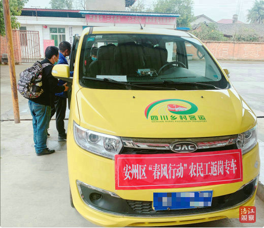 安州区“春风行动”中“小黄车”作为农民工返岗专车