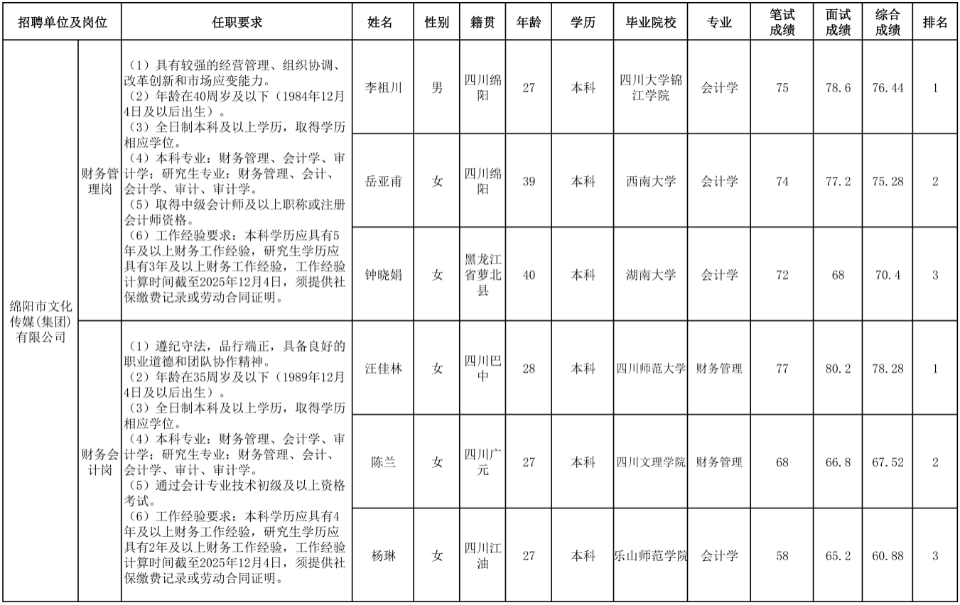 根据《绵阳市文化传媒(集团)有限公司关于招聘财务人员的公告》的规定,经笔试、面试等程序,现将笔试和面试成绩予以公示。