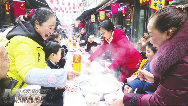 1月26日,盐亭县凤灵街道南街社区居民们聚在一起赏歌舞、品热粥、拓福字、吃长桌宴,拉近了邻里距离。 记者 彭紫薇 摄