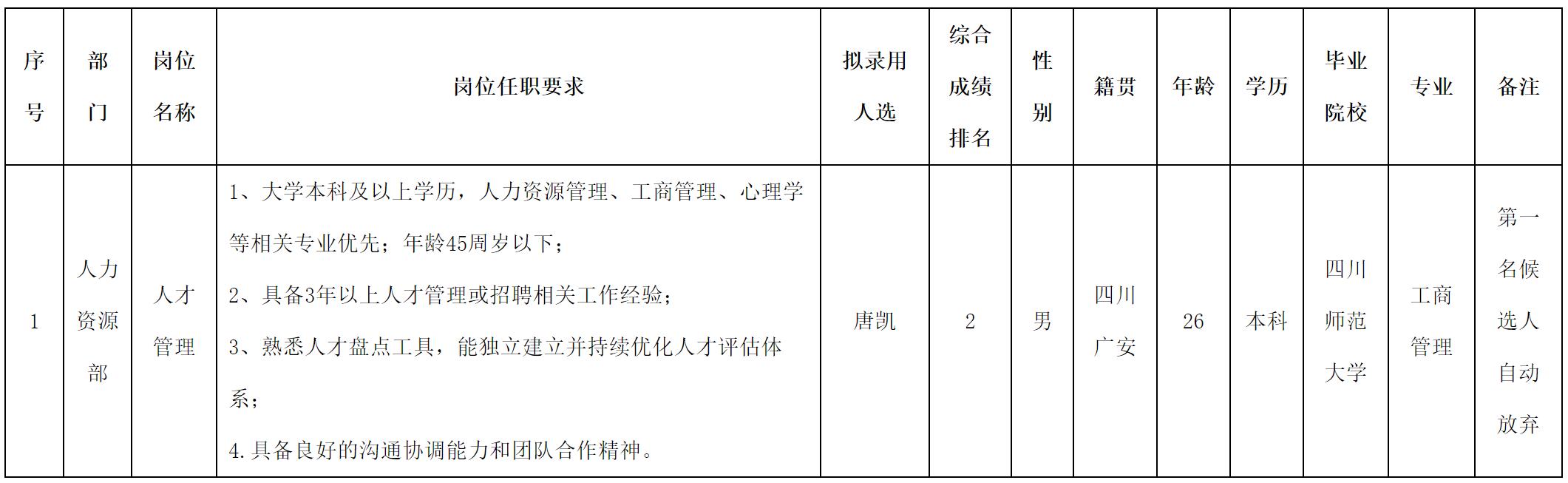 根据四川华丰科技股份有限公司发布的招聘公告及招聘相关规定,经测试等程序,拟录用唐凯同志到四川华丰科技股份有限公司工作,现予以公示,具体情况如下: