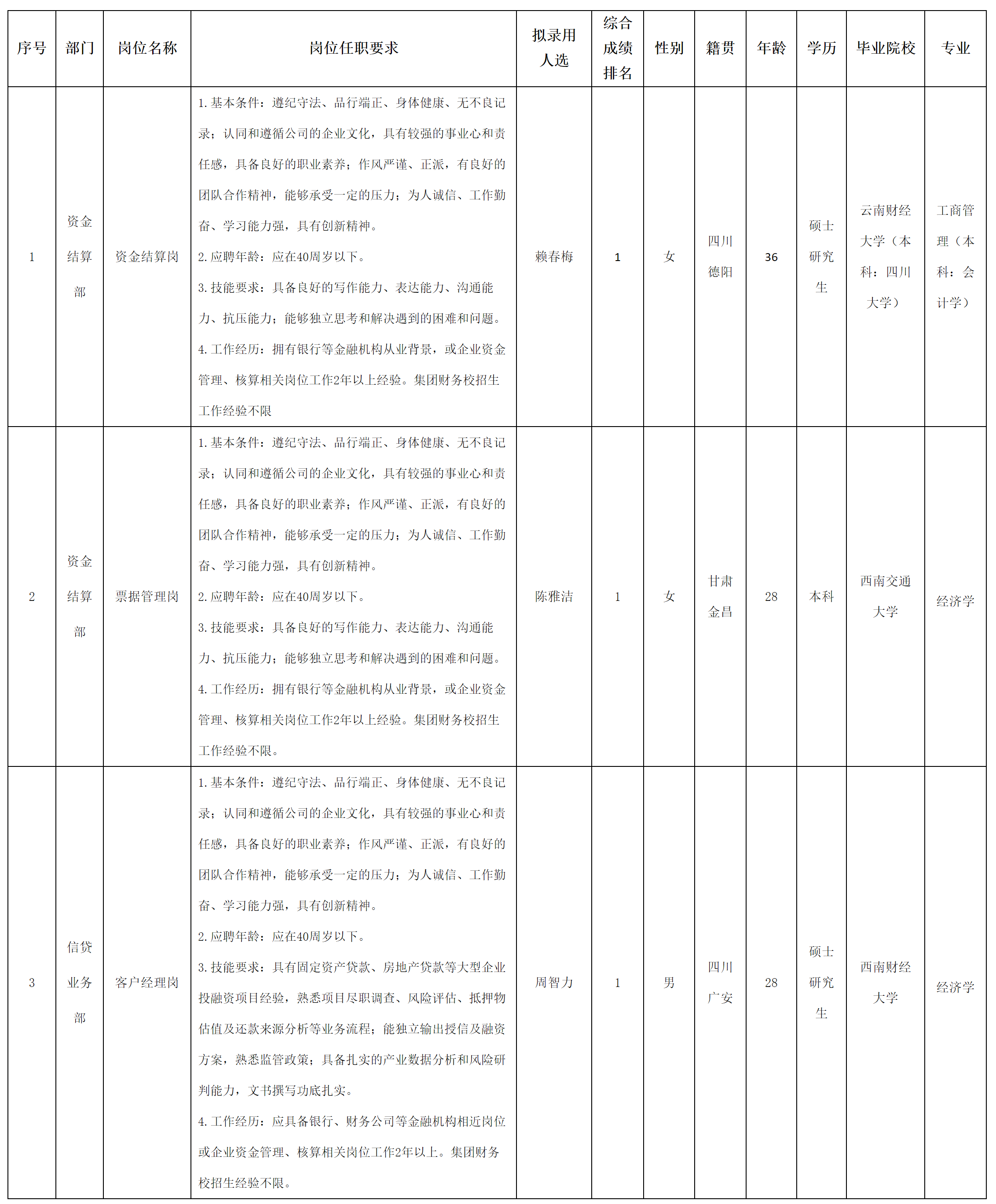 根据四川长虹集团财务有限公司发布的招聘公告及招聘相关规定,经面试、考察、体检等程序,拟录用赖春梅、陈雅洁、周智力3位同志到长虹财务公司工作,现予以公示,具体情况如下: