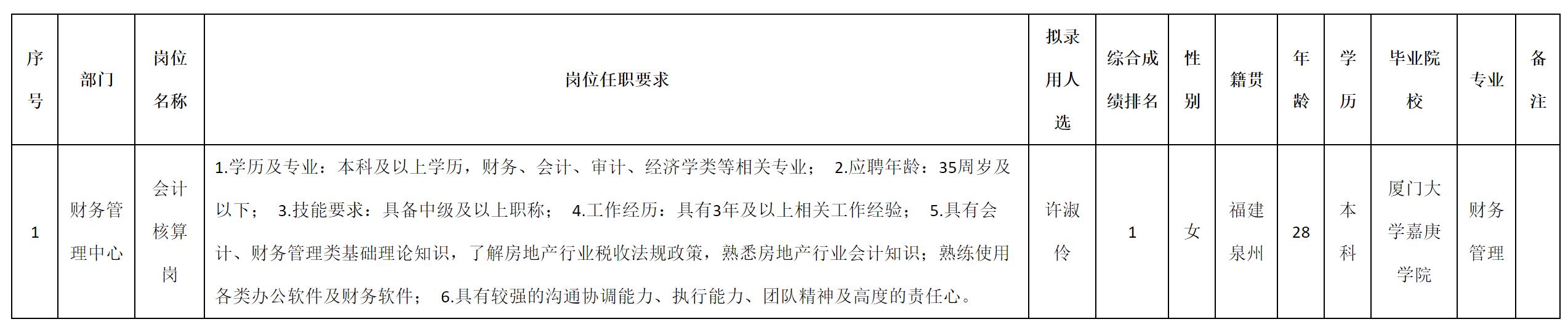 根据九洲千城置业有限责任公司发布的招聘公告及招聘相关规定,经测试、考察、体检等程序,拟录用许淑伶同志到九洲千城置业有限责任公司工作,现予以公示,具体情况如下: