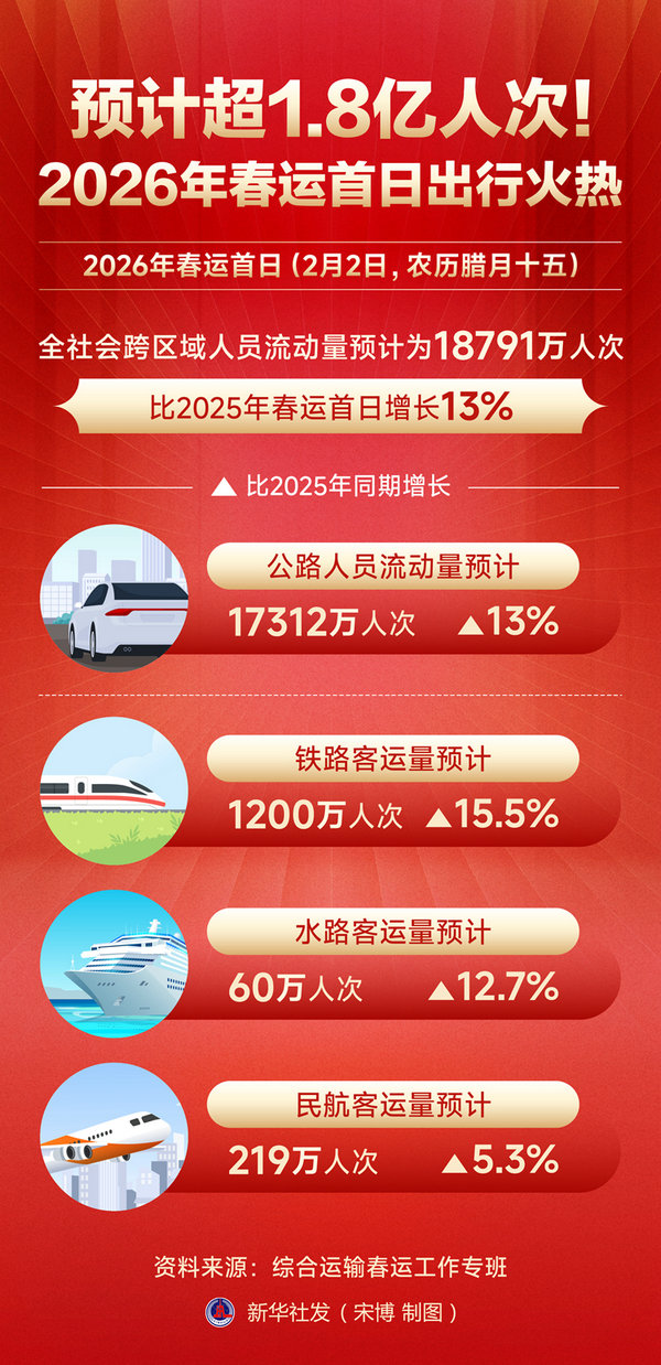 新华社北京2月2日电(记者叶昊鸣)记者2日从综合运输春运工作专班获悉,根据专班数据显示,2026年春运首日(2月2日,农历腊月十五),全社会跨区域人员流动量预计为18791万人次,比2025年春运首日增长13%。