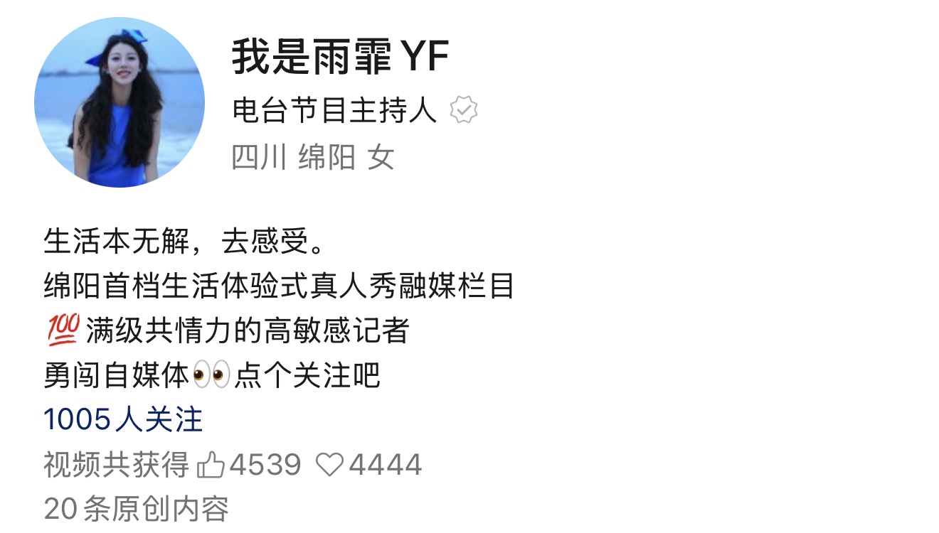 “我是雨霏”账号属于绵阳市新闻传媒中心FM103.3民生类广播节目《直通1033》的垂类新媒体账号,着力于打造绵阳首档真人生活体验融媒栏目。