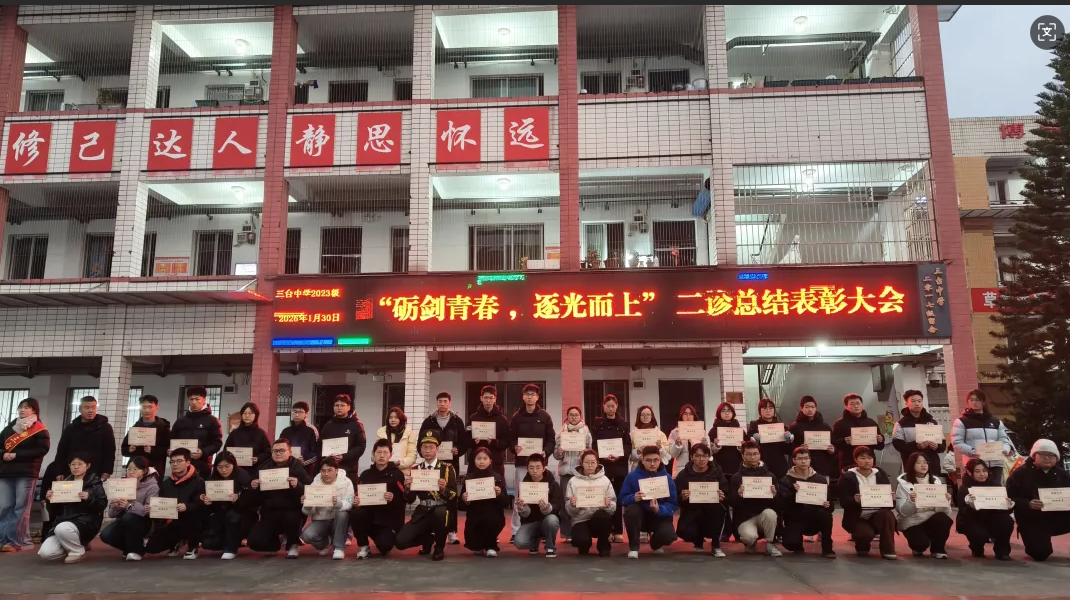 2026年1月30日上午,三台中学高2023级在分部运动场隆重举行了以“砺剑青春,逐光而上”为主题的二诊总结表彰活动。全体师生以荣光致敬过往,以壮志奔赴未来,为高考冲刺的关键征程,吹响铿锵有力的奋进号角。