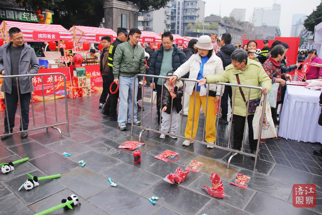 活动现场还设置了“青睐绵阳 好运套圈”趣味游戏区和“青睐绵阳 羌风藏韵”快闪表演。游客围绕在“青睐绵阳 悠游周末”“青睐绵阳 熊猫有约”“青睐绵阳 诗路行吟”“青睐绵阳 星火征途”打卡装置前拍照留念,参与互动游戏,赢取熊猫公仔、米粉、帆布包等“绵阳好礼”。