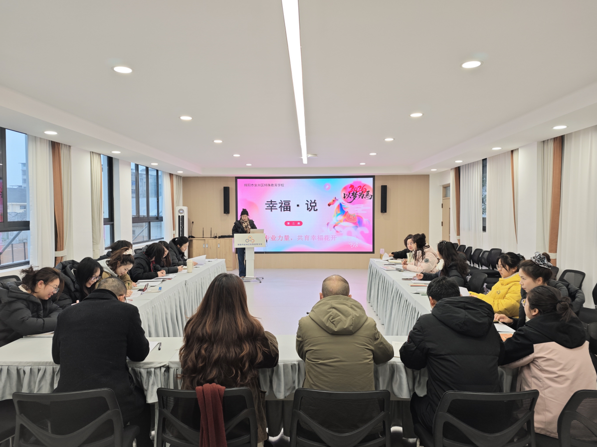 为了深化“幸福教育”文化理念,打造专业化、学习型的教师团队,提升教职工的职业幸福感与育人胜任能力,2026年1月25—26日,安州区特殊教育学校全体教职工齐聚在学校二楼会议室,举办了以“汇聚专业力量 共育幸福花开”为主题的第二届“幸福·说”系列活动。活动紧紧围绕“专业成长”与“团队共融”两大核心,结合特教工作实际精心设计了六大主题环节,兼顾专业性与人文性,让每一位教职工都能在参与中收获成长、凝聚温情。