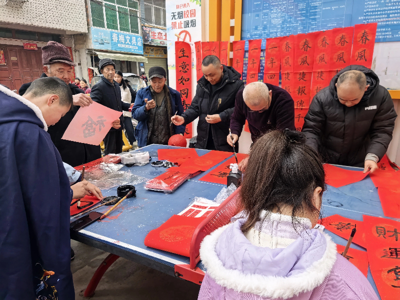 上午9时,活动在黄土镇小学门口拉开序幕,吴永贵,张利东等4位老师,以及书法组葛雨涵、陈娅萱、余诗淇、刘诗琪、李昱洁、唐天杰,宋秋衡等7名孩子,迎着寒风,挥毫泼墨,免费为老百姓书写春联和福字,为老百姓送去新春祝福。老百姓纷纷走上前来,观看老师和孩子们的书写,感悟中华传统书法艺术的独特魅力,并频频发出赞叹声。老百姓免费领到一幅幅春联,一个个精美的福字,以及新年红包,灯笼,脸上绽开了幸福的笑容。“既有党员老师的专业笔墨,又有孩子们的童真祝福,这样的春联贴在家里,年味儿更浓!”一位领到春联的老奶奶笑着说道。